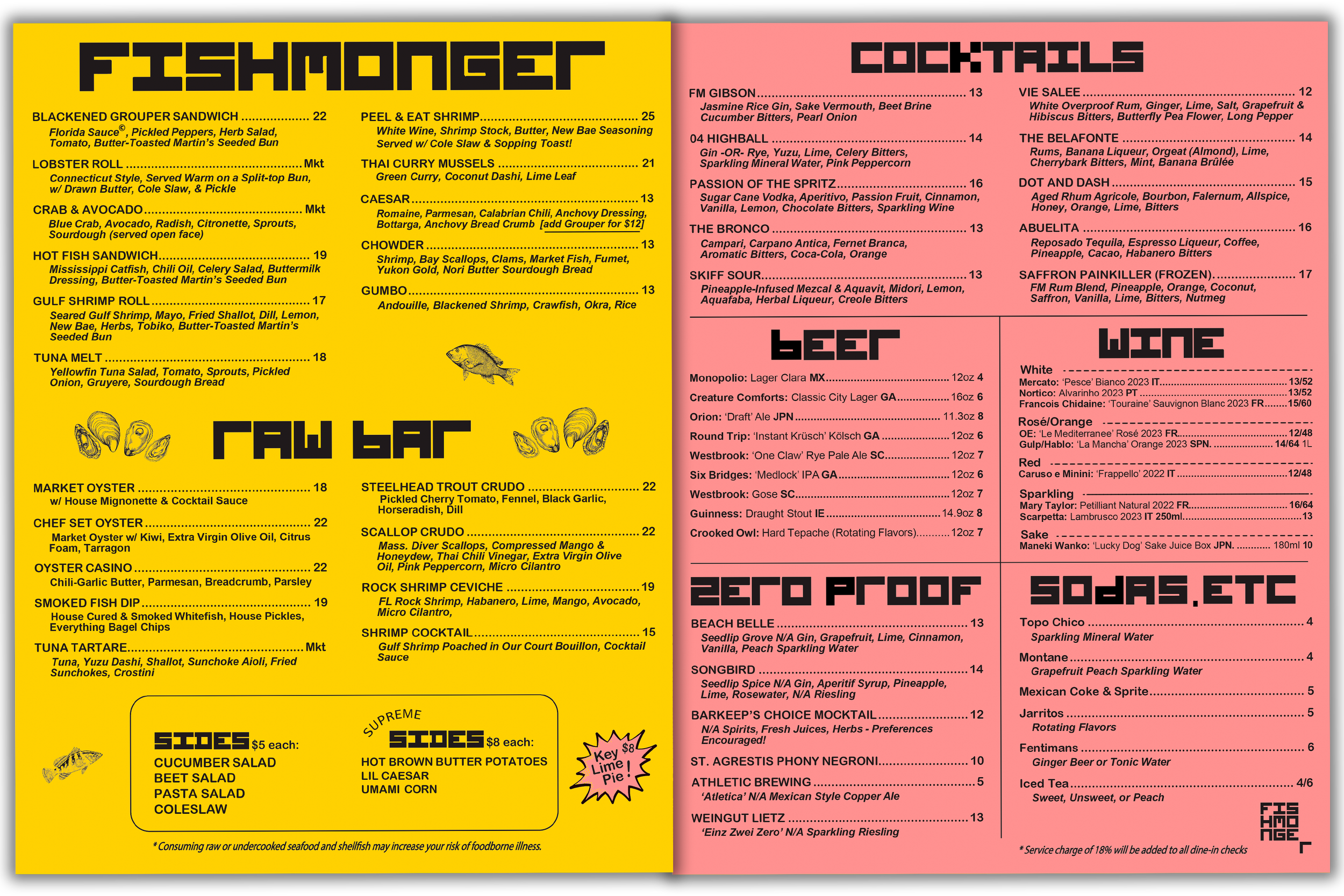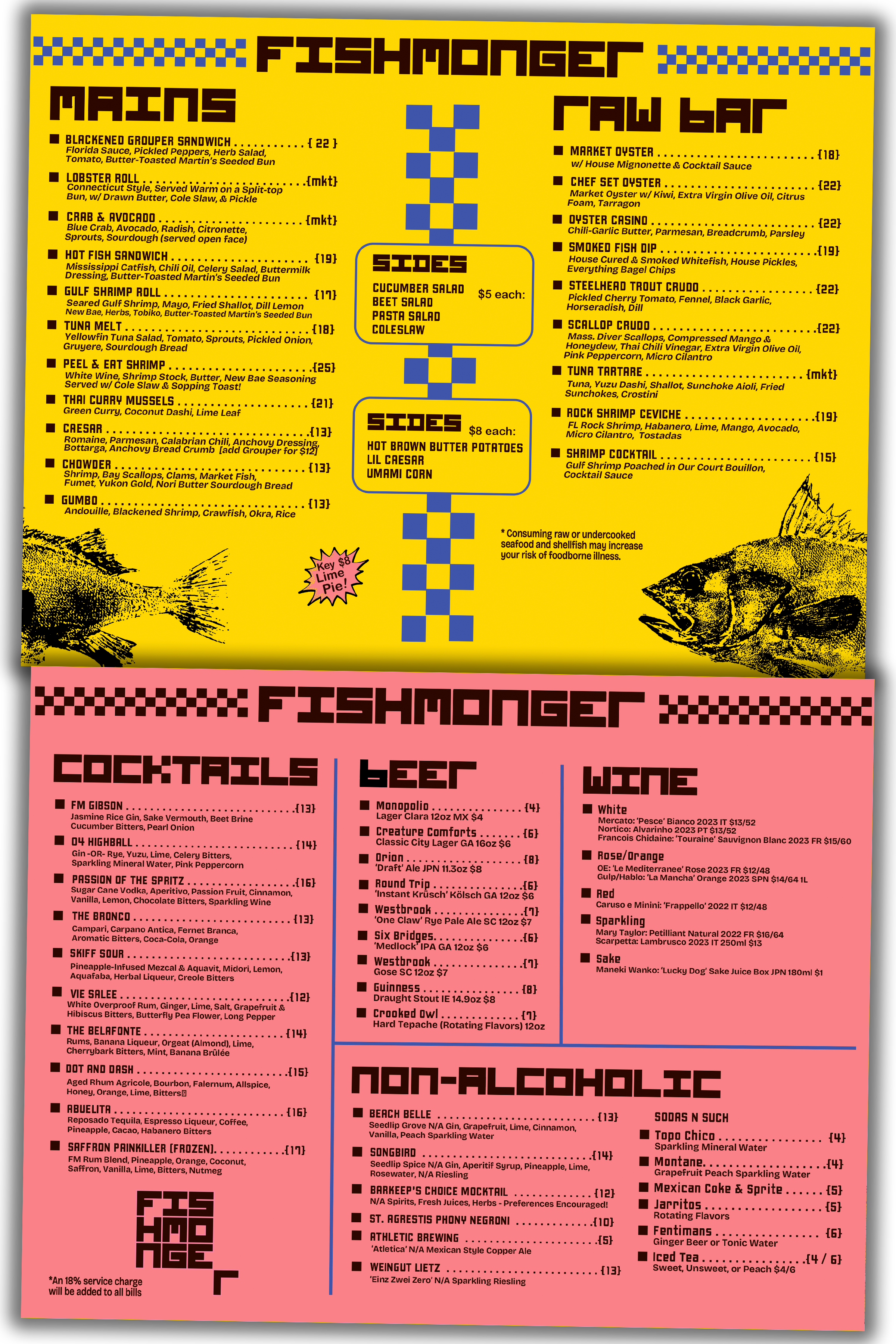 Menu samples designed for Fishmonger, an Atlanta-based seafood restaurant. These designs were created for Fishmonger’s latest Nashville locations.